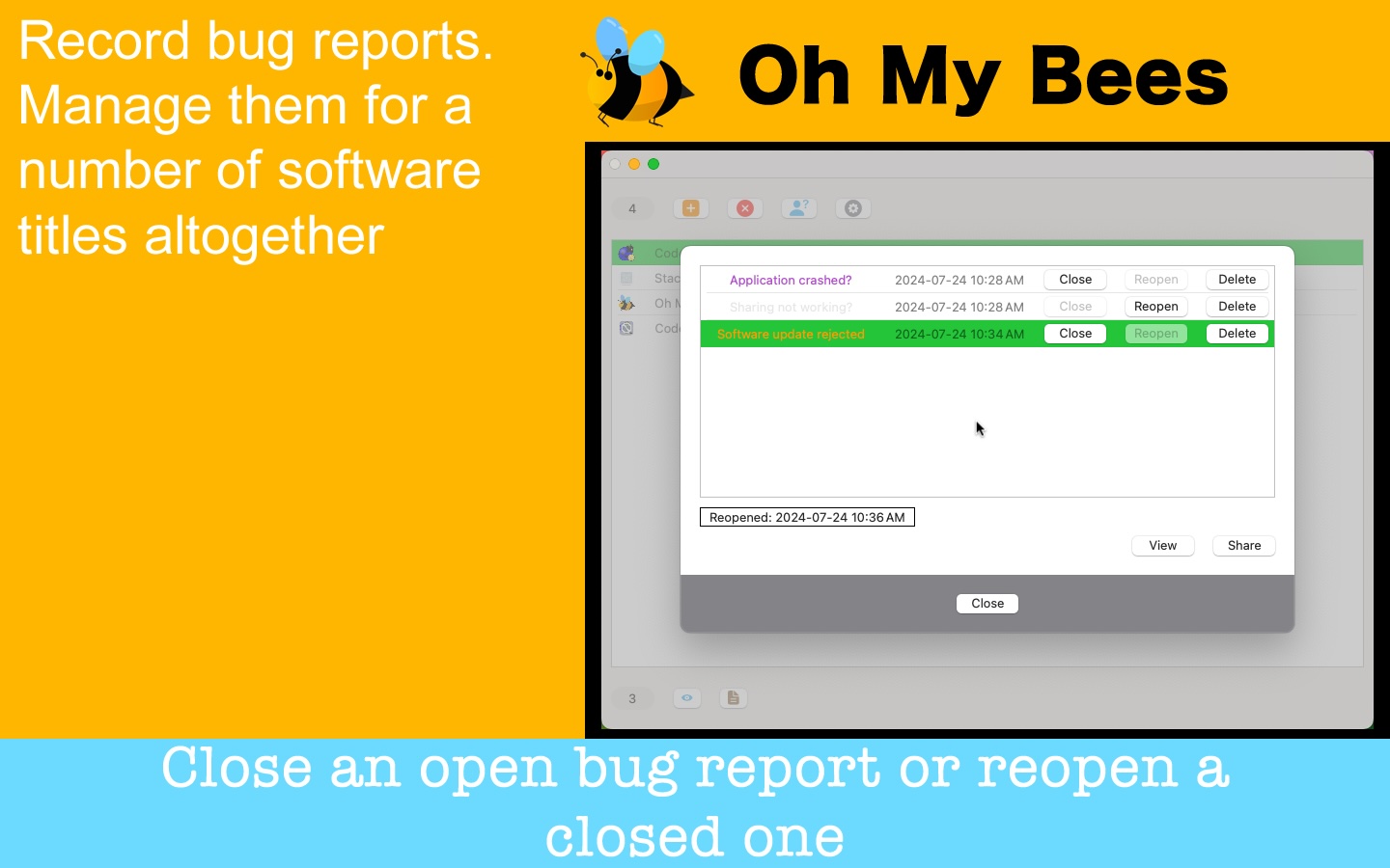 Oh My Bees is a relatively small application that you can use to manage software bug reports. You can open a bug report, selecting a seriousness level. You can close a ticket without destroying it. And you can reopen a closed one if necessary.