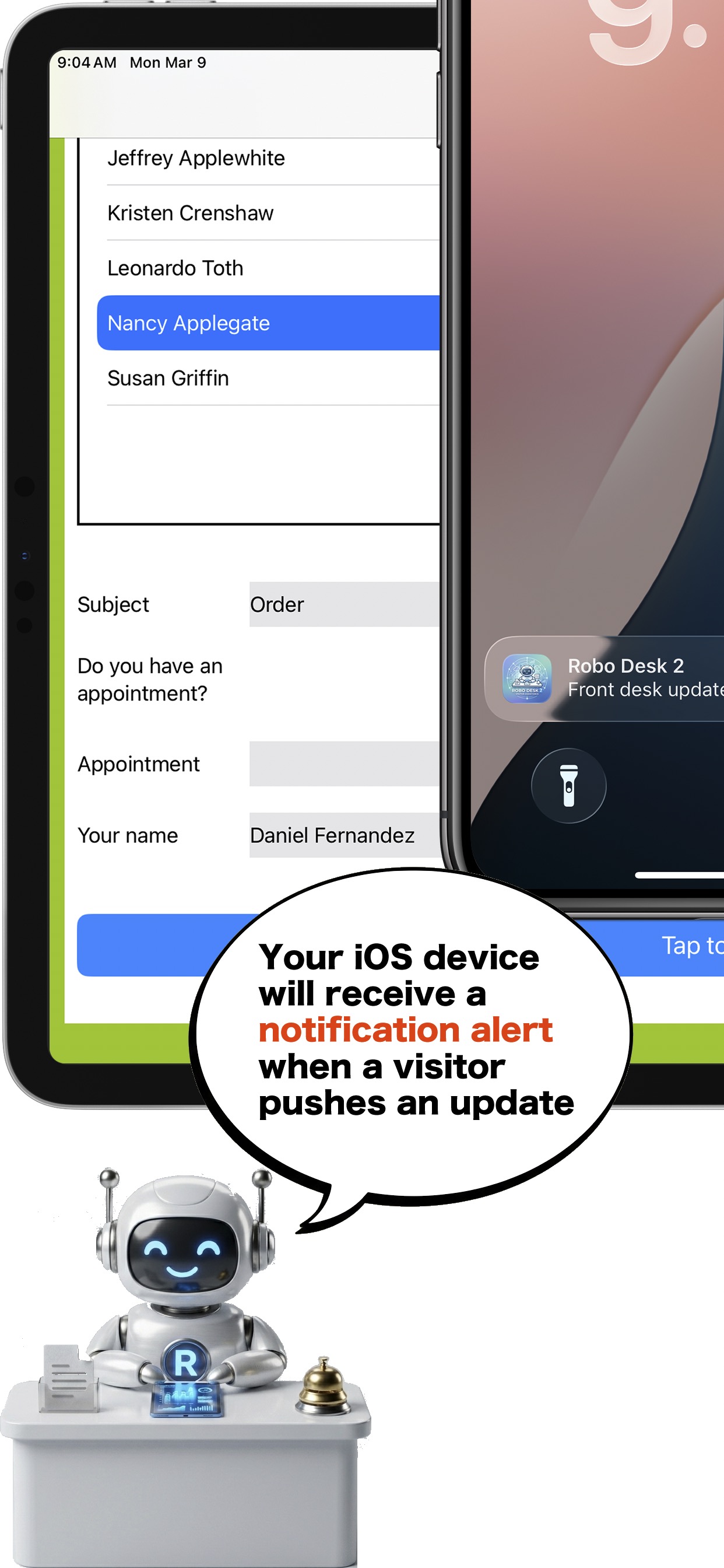 Robo Desk 2 lets you create a list of employees that your visitors to have an appointment with. It’s up to you as an office administrator to decide whether a visitor must have an appointment and select one to see. When a visitor taps the submit button, Robo Desk 2 will send a reception update to anyone responsible for the front desk. You can enlist as many front desk handlers as you need. Just send each of them an invitation. Once they accept your invitation, the handshake between the front desk handler and the administrator is complete.