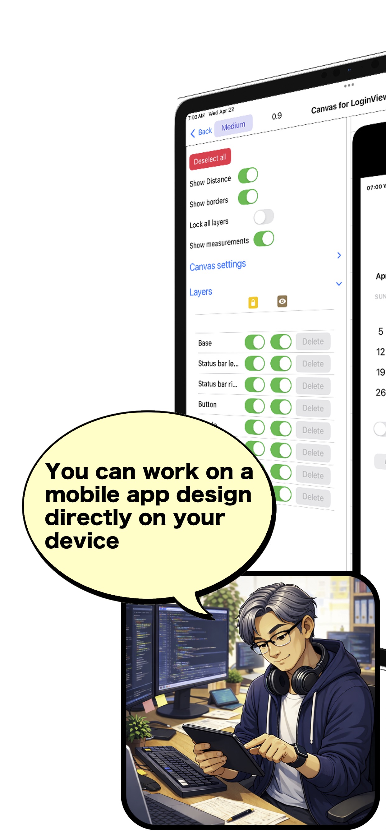 Design Mob supports more than twenty phone and tablet screen sizes in addition to more than twenty mobile UI components including Button, TextField, Map, Switch. So all you to do is add this and that to the canvas. Move them to the right place, change the text color and so forth. You can also create a drop-down menu with actual tab names.