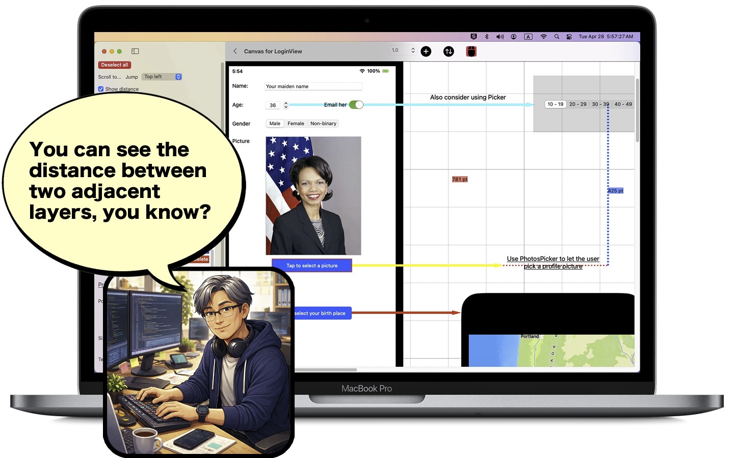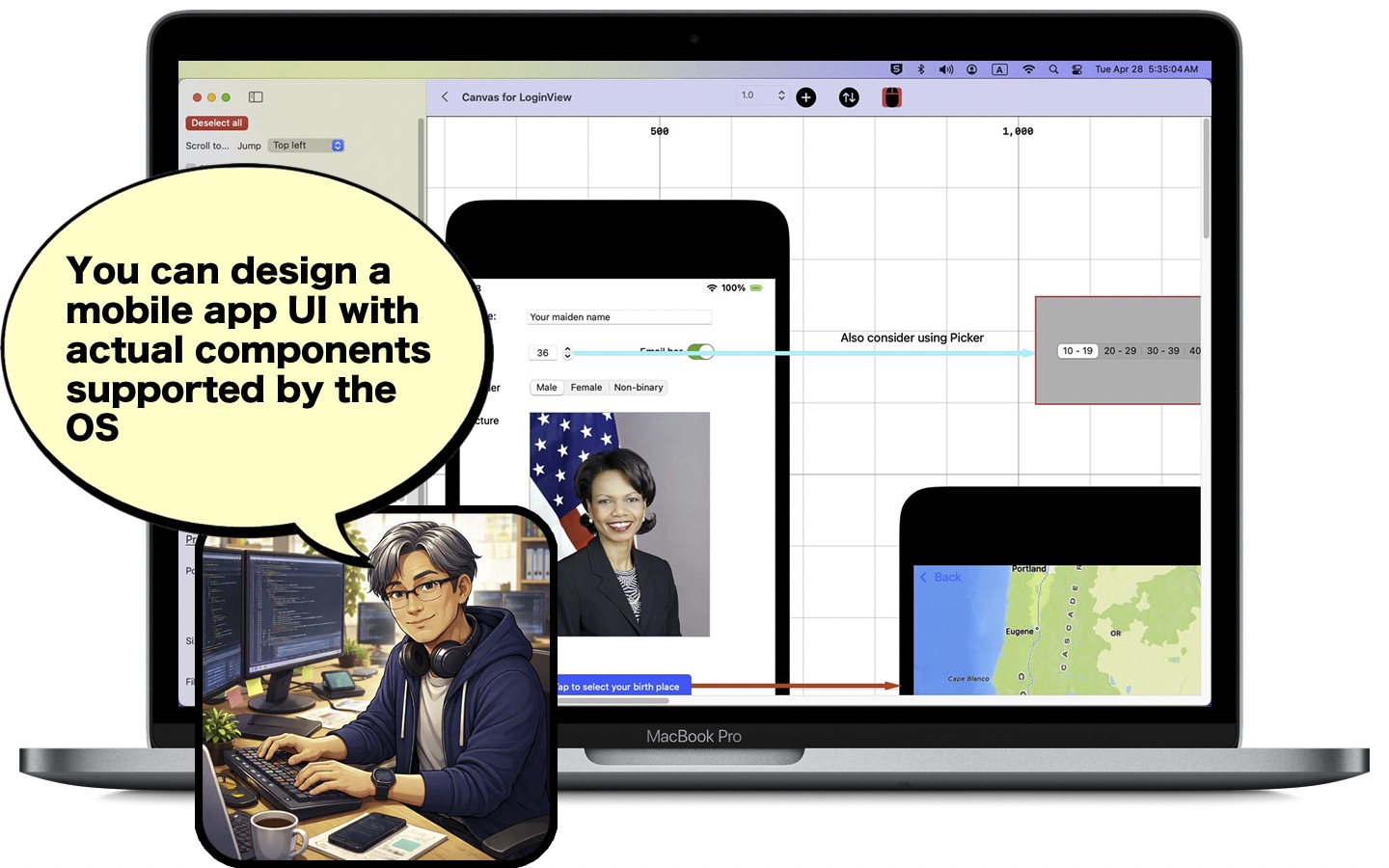 Speaking of UI components, you can use actual tab names to create a picker layer. Use actual GPS coordinates with a map layer. Also, you can use the actual URL to show the web content with a web view layer.